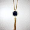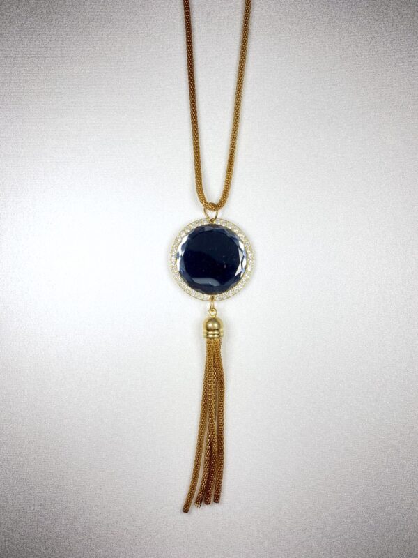 Zarif ve modern tasarımıyla dikkat çeken bu kolye, herhangi bir değerli metal içermeyen özel bir koleksiyondur. Göz alıcı siyah taş ve etrafındaki ışıltılı detaylar, şıklığınızı artırırken her türlü kıyafetle kolayca kombinlenebilir. Uzun altın rengi zinciri ve güzel püskülü ile hem günlük kullanıma hem de özel davetlere uygundur. Bu kolye, stilinizi tamamlayacak mükemmel bir parça olmakla kalmayıp, aynı zamanda hediye etmek için de harika bir seçimdir.