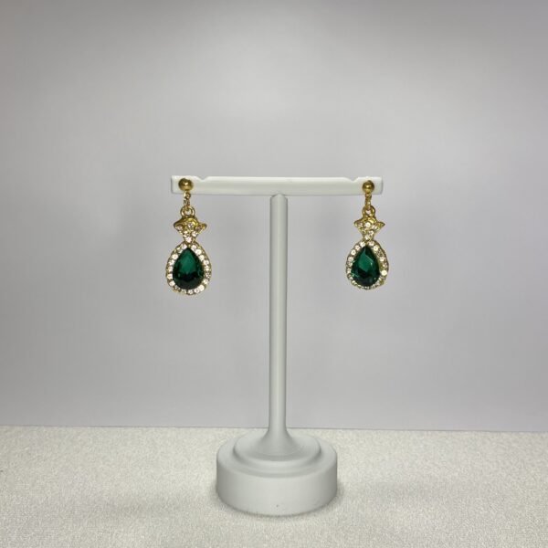 Bu şık damla küpe, zarif bir tasarıma sahiptir. Ortasında zümrüt rengi bir taş ve etrafını çevreleyen göz alıcı, parlak taşlarla bezeli bir çerçeve bulunur. Küpenin üst kısmındaki zarif detaylar, hem özel etkinliklerde hem de günlük kullanımlarda dikkat çekici bir görünüm sunar. Metal içermeyen yapısı sayesinde hafif ve rahat bir kullanım sağlar. Damla kesimi, modern bir estetik yaratırken ışıltılı taşlarla çevrili bu küpeler, stilinize sofistike bir dokunuş katmak için idealdir.
